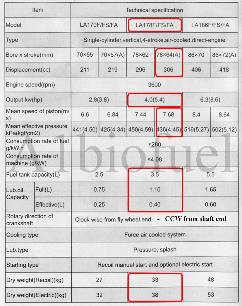 Model LA178FA 6 hp Diesel Engine Specifications: